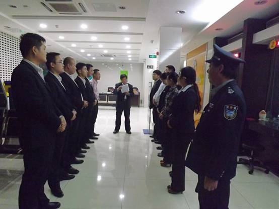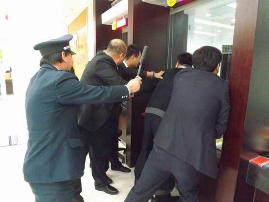 为有效预防暴力抢劫银行营业机构,更好的保护员工人身及公共财产安全,提高员工应对突发事件能力,营造沪农商员工关心和支持安全工作的新局面,2013年11月7日晚,在我行营业大厅开展了防抢防爆应急处置预案演练。